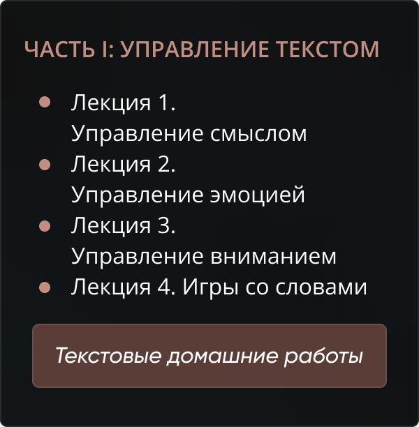 Лекция 1. Управление смыслом Лекция 2. Управление эмоцией Лекция 3. Управление вниманием Лекция 4. Игры со словами
