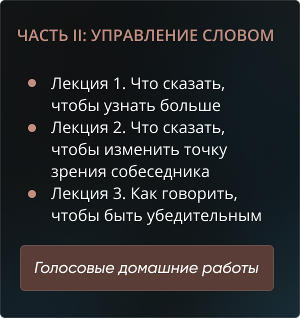Лекция 1. Что сказать, чтобы узнать больше Лекция 2. Что сказать, чтобы изменить точку зрения собеседника Лекция 3. Как говорить, чтобы быть убедительным