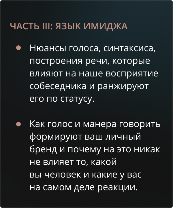 На курсе мы поговорим о коммуникации, о языковых приемах, которые можно использовать в общении и на письме, о навыках правильной речи и том, как вокабуляр, интонации и фразы, которые вы используете, влияют на ваш имидж.